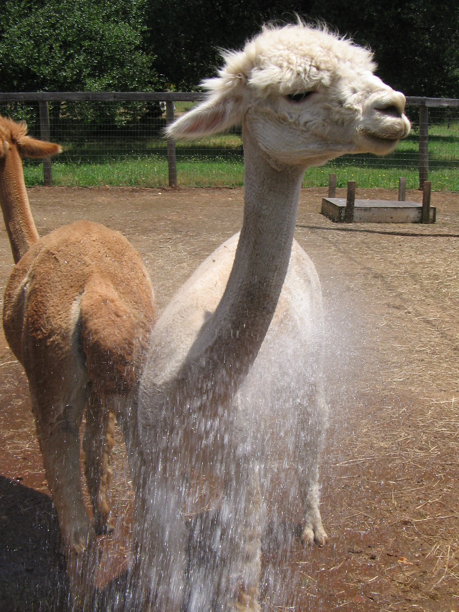Yes it can. The fiber can rott or become felted on the animal. Alpacas do like water and they also like to roll in the dirt. Wet or damp fiber and rolling can create a funny looking felted alpaca. However it could also create skin infections and other health problems for your animals besides being a nightmare for your shearer. During hot weather spray or squirt the belly of your Alpaca, Llamas or camels where there bodies thermostat is located. This will cool them down and make them very happy.